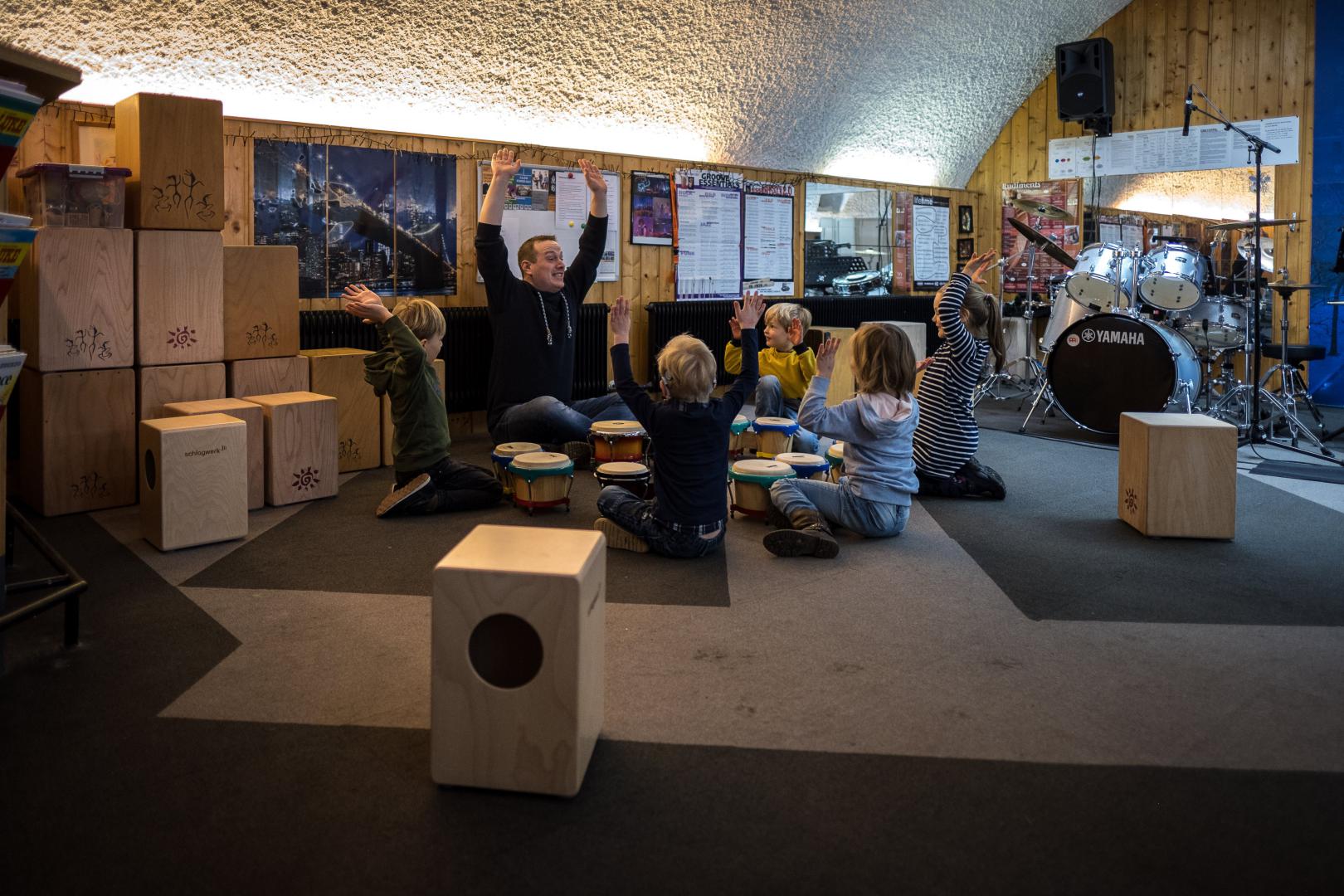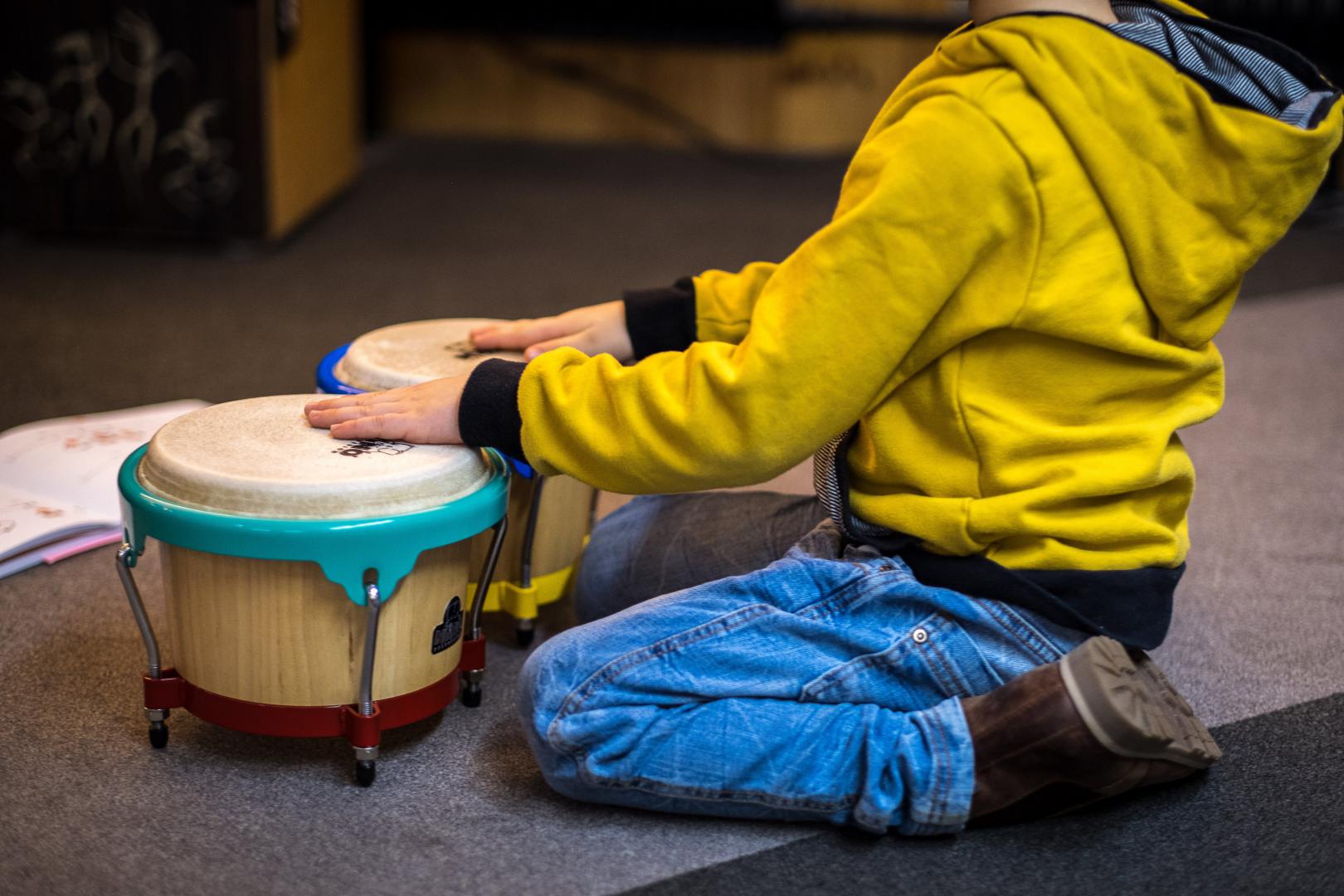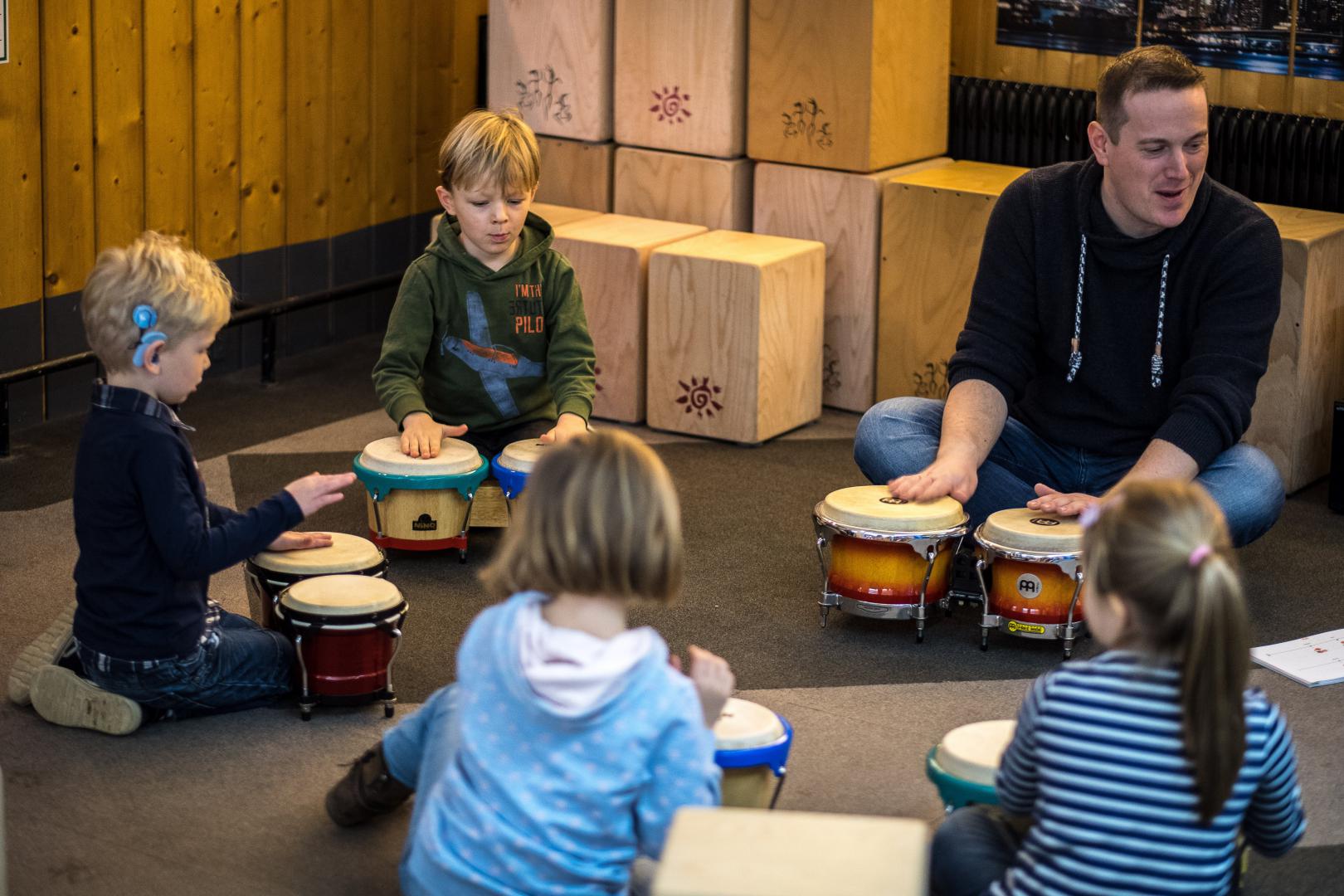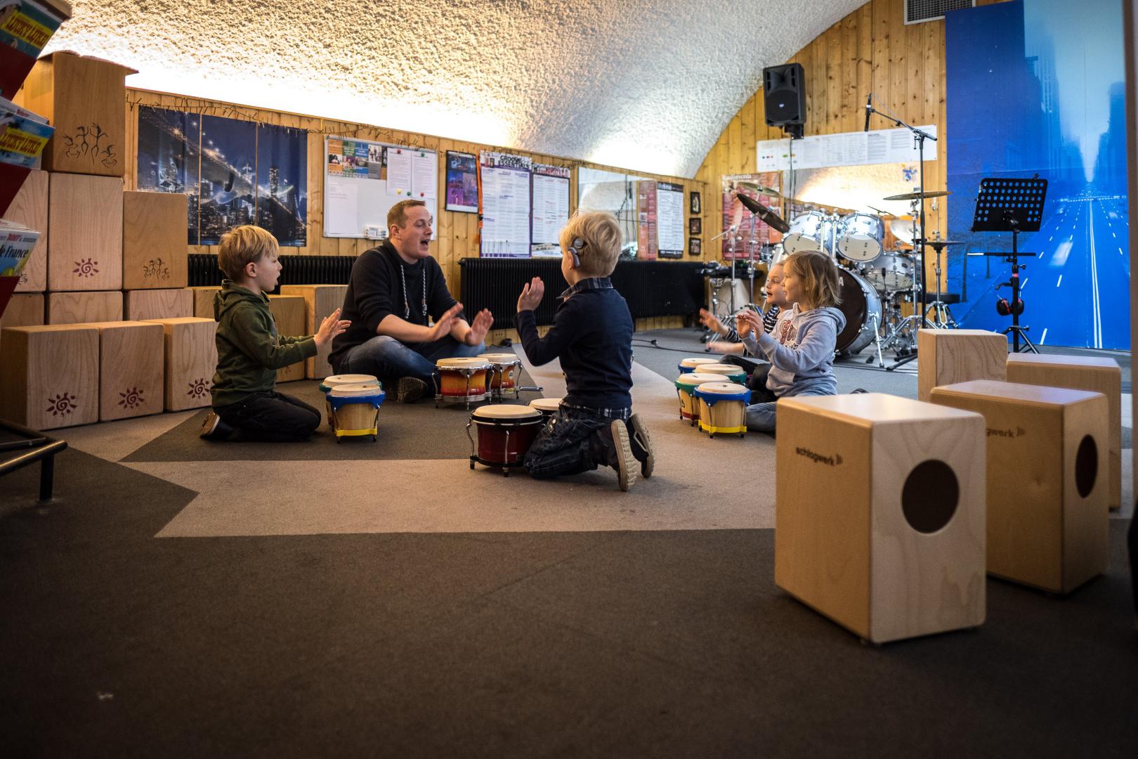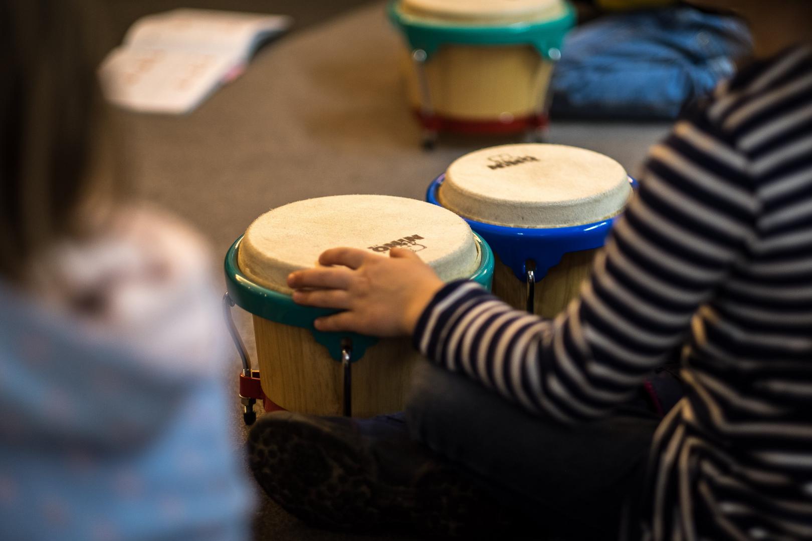 Der Unterricht beinhaltet das Singen von Liedern und das Musizieren mit einfachen Rhythmusinstrumenten wie Bongos, Cajons, Shaker, Triangeln und Trommeln.