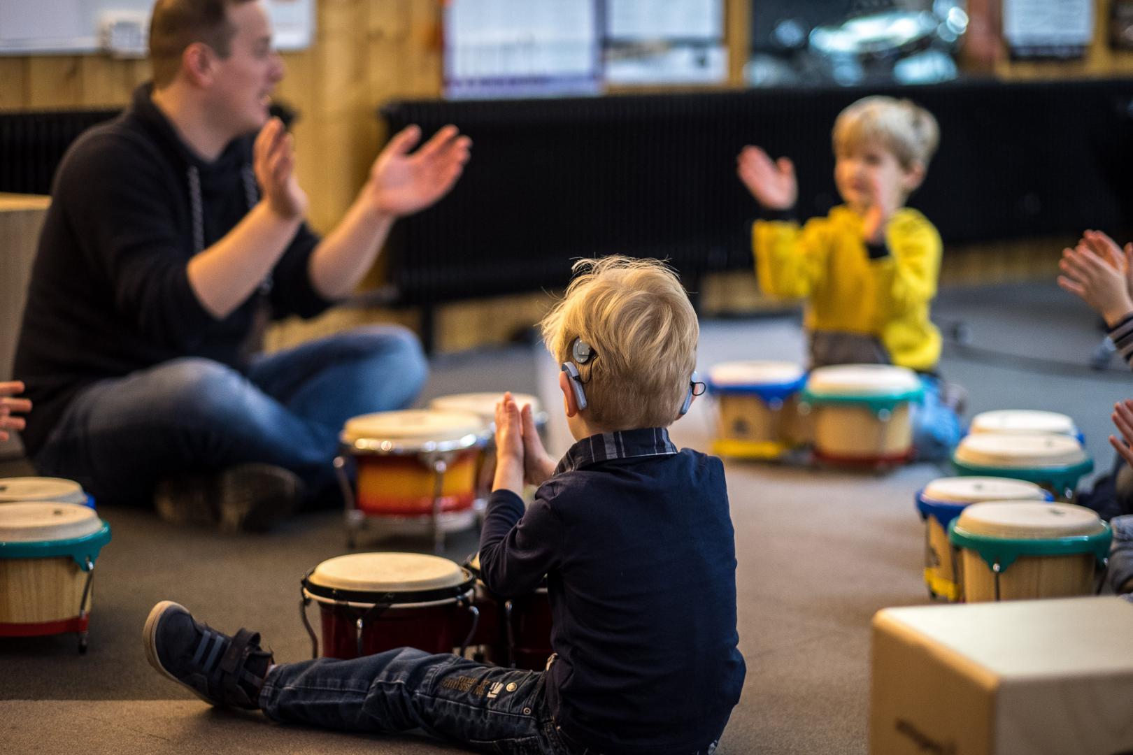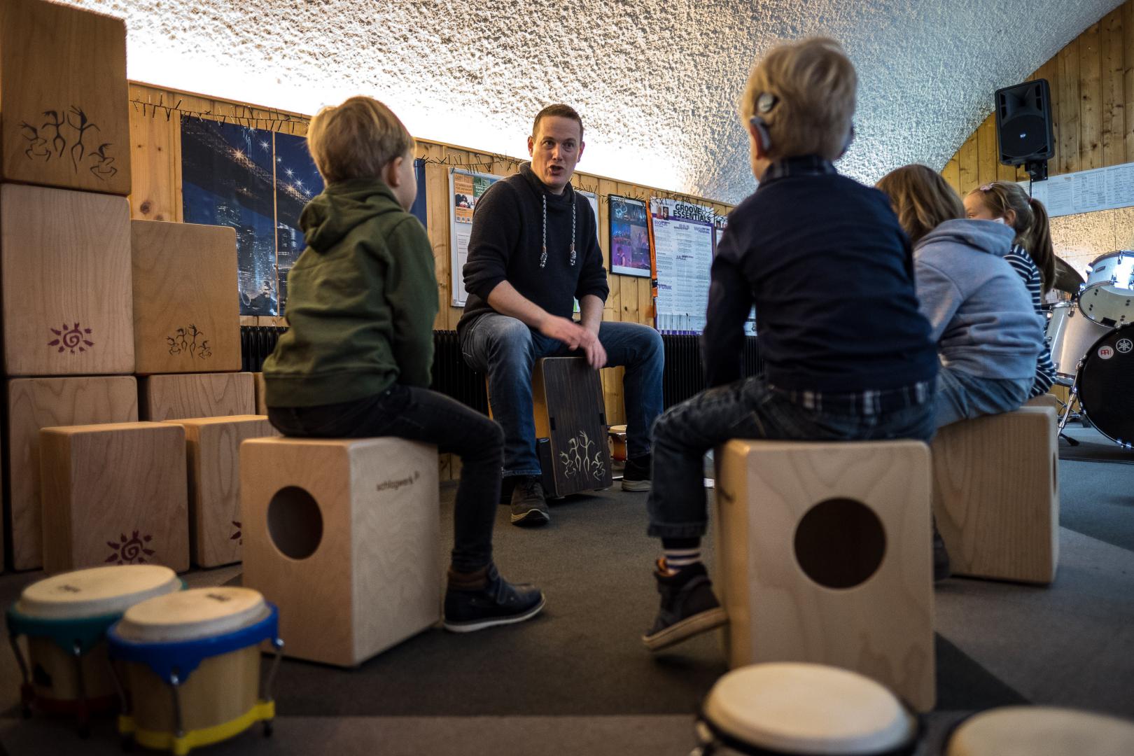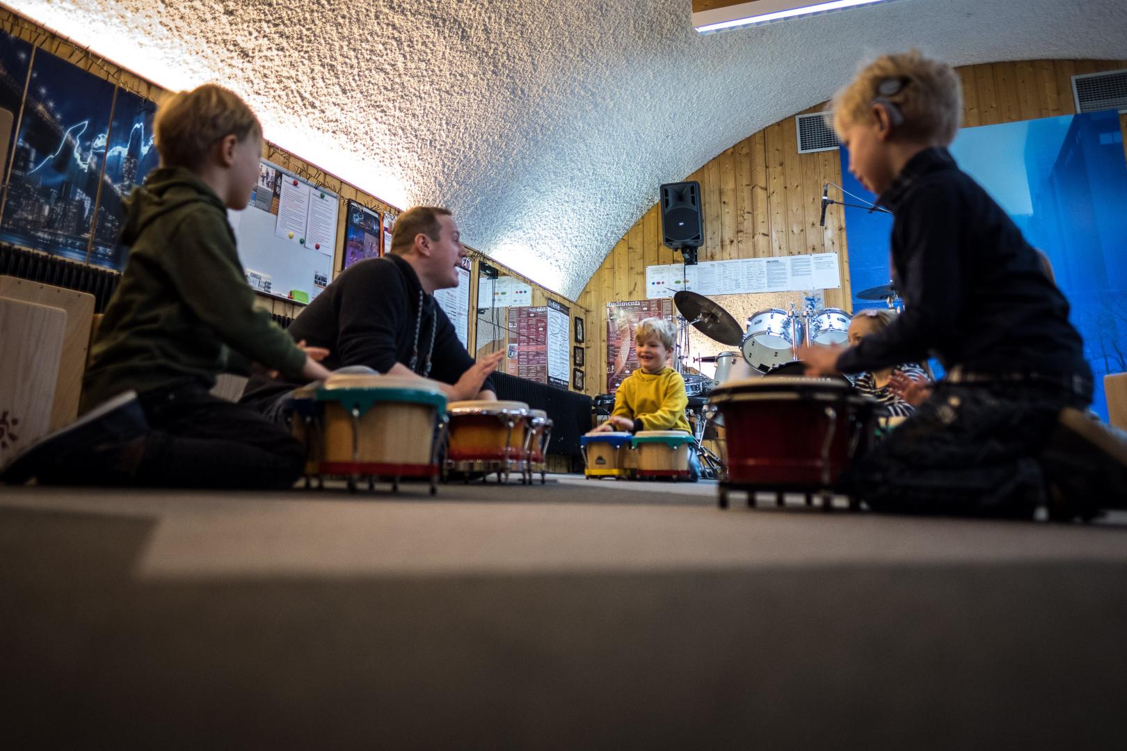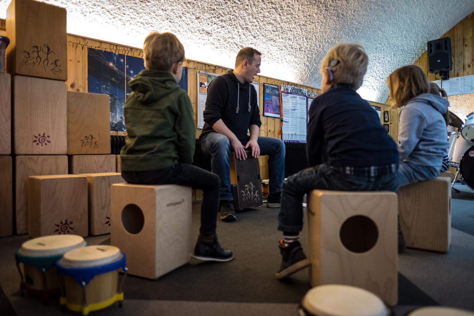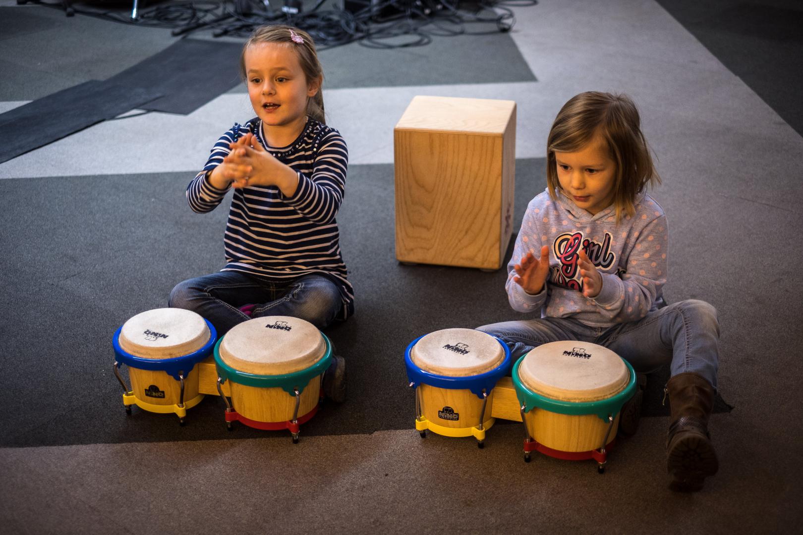 Der Unterricht beinhaltet das Singen von Liedern und das Musizieren mit einfachen Rhythmusinstrumenten wie Bongos, Cajons, Shaker, Triangeln und Trommeln.